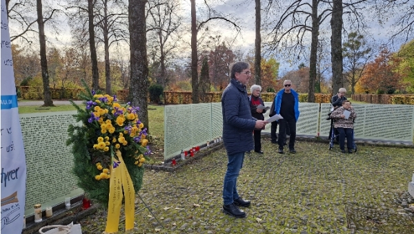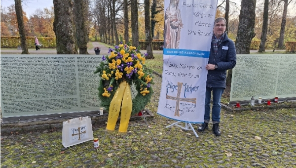Foto: Gebet an Allerheiligen 2023 am Gedenkort im Ehrenhain I des Friedhof Perlacher Forst, München. Rechte beim Verein Selige Märtyrer e.V.