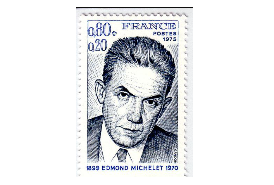 Fotos: Edmond Michelet nach der Befreiung aus dem KZ Dachau in Häftlingskleidung; Der französische Politiker Edmond Michelet. Foto: Gemeinfrei; Dieser Platz im Stadtzehnrum von Paris wurde nach dem Politiker benannt. Foto: Gemeinfrei; .1975 gab die französische Post diese Gedenkmarke an Edmond Michelet heraus. Foto: Gemeinfrei